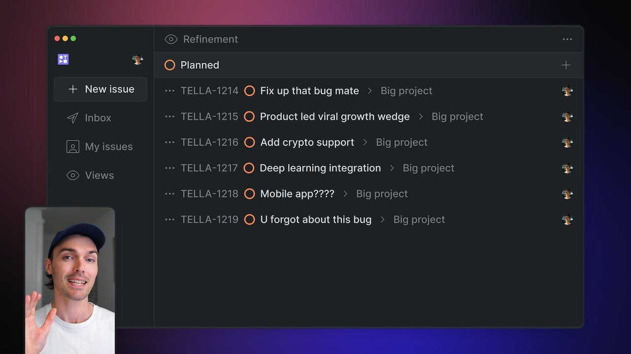 Log in or sign up for Tella. It only takes a couple of clicks. Then, open the screen recorder and pick the screen and camera you want to share. Press “Start recording.” Record your update for your standup with as many clips as you need.