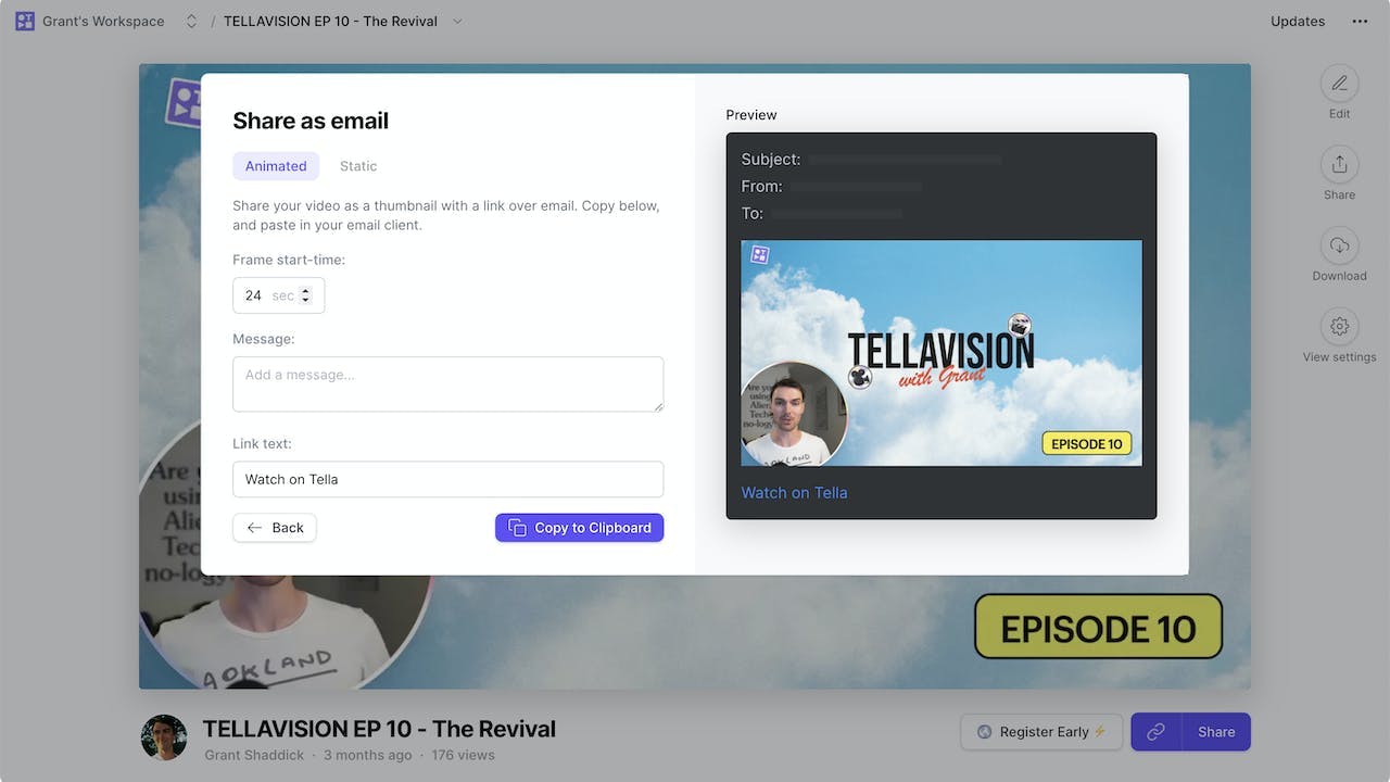 When you’re done, just click “Finish,” and you’ll be redirected to the page your viewers will see if you share your recording. There you can click "Share" and select the email option. You'll be able to copy the GIF preview and paste it into an email. You can also pick which time you want to generate the GIF preview from in the video.